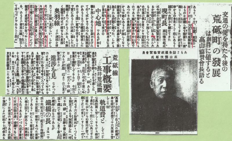 さてこうした荒砥町の軽便鉄道にかけた情熱は、どこから生まれたのでしょうか。その一端が知れるものとして、大正12年4月22日に掲載された荒砥町長の談話を紹介したい。 荒砥は最上川舟運の時代は交通の要衝であり、置賜村山の物資の集積地であった。それが奥羽線の開通後は赤湯が拠点となり、長井線の開通により長井町が地方の中心地であるようになった。このままでは荒砥は廃れるばかりである。荒砥までの延長によって、奥羽線と連絡できた事は喜ばしいが、今後は左沢と結び仙山鉄道と坂町線によって仙台、越後と直接交流することが必要だ、というのである。当時の荒砥町の危機感と夢の大きさを感じるものである。 荒砥駅の開業は15年以上の闘いの歴史であった。「天地人」ではないが、天の時にも恵まれず地の利もなく、人の和のみで挑んだ戦いであったのだろうか。新聞記事で「近い将来、村山左沢と接続することは既定の事実である」と評された左荒線も、何度も紆余曲折を繰り返しながら、結局は実現されることはなかったのでした。 【新聞記事提供:米澤新聞 大正12年4月22日(二)】