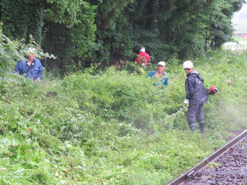 6月30日、羽前成田駅・白兎駅協力会とおらだの会会員が共同で、駅周辺の柴刈り・草刈り・花植え作業を行いました。この日は、あいにくの雨模様でしたが、47人の会員が雑木や蔓に果敢に立ち向かいます。 「アジサイは残したいよね」「桑の木には歯が立たない」「去年よりは楽になったかな」とは、休憩時間の会話です。共同作業は今年で3年目になりますが、「程良い田舎」とか「美しい自然」を維持するのは大変ですね。順次、ビフォー・アフターを紹介しますので、作業をしてくれた皆さんの顔を想い浮かべながら、眺めていただけたらなぁ、と思います。