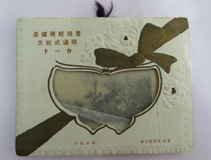 軽便鉄道長井線の赤湯〜梨郷間が開通したのが大正2年(1913年)10月26日。この際に、宮内町で発行された「開通式記念カード」です。各町村では、商店などが発行した記念絵ハガキはありますが、宮内町の記念カードは町内企業が共同で発注したものと思われます。現在のウェディングカードのように、とてもセンスのある装丁になっています。制作会社である「東京青雲堂」は、東京大正博覧会の絵葉書の制作なども行っていたようで、著名な会社だったかと思われます。 【資料提供:ふるさと資料館・時代のわすれもの(南陽市宮内)】