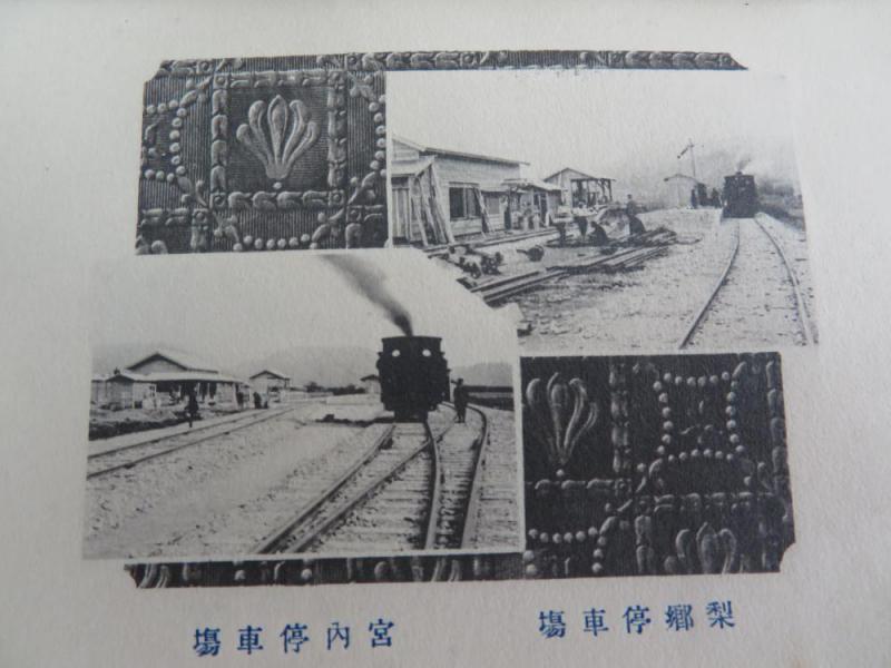 宮内駅と梨郷駅の写真です。当時の終着駅であった梨郷駅は、まだ工事中のようですが、今と比べるとかなり大きな駅舎で、島形ホームの姿がわかるようです。宮内駅は、ホーム内の回廊は見えないようですが、本屋の支柱の様子は今と同じように見えます。広々とした敷地に建てられていて、西部劇に登場するワンシーンのようです。また生地になっている文様も、とても品格が感じられるデザインとなっています。 【資料提供:ふるさと資料館・時代のわすれもの(南陽市宮内)】