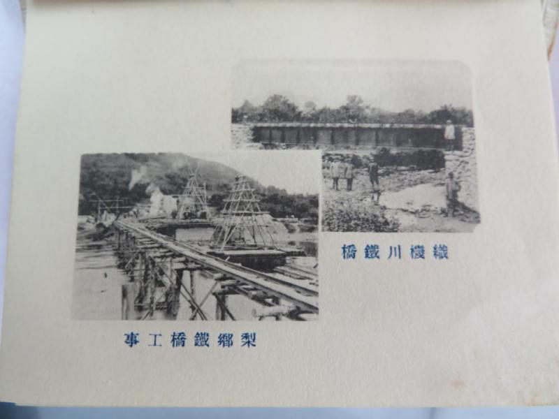 この記念カードには宝物のような写真がたくさんあります。これもその中の一枚です。「織機川鉄橋」と「梨郷鉄橋工事」のキャプションがあります。梨郷鉄橋は、現在は「松川橋梁」と呼んでいる鉄橋で、フラワー長井線を代表する撮影スポットの一つです。翌年(大正3年)の梨郷〜長井間の開通に向けて、建設が急ピッチで進められていたようです。鉄橋がカーブしている様子も見えます。 【資料提供:ふるさと資料館・時代のわすれもの(南陽市宮内)】