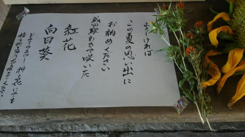 羽前成田駅の待合室に、紅花と向日葵を置いています。おらだの会の若手会員と鮎貝りんごちゃんが育てた花です。ふるさとのお土産にどうぞお持ち下さい。