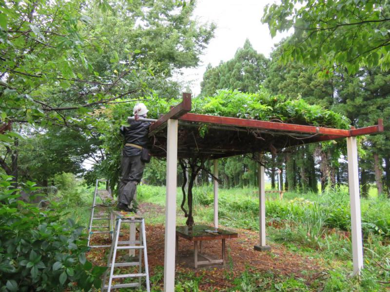 9月に入って雨の日が続いていますが、会員の一人が「雨で仕事が休みだから」と、藤棚の剪定作業を行ってくれました。伸び放題になっていた枝の剪定には、朝の9時から午後4時まで、一日がかりの仕事となりました。 この藤棚は、地元の先輩たちが昭和63年(1988年)にトイレや花壇の生垣などと一緒に整備してくれたものですが、ここ数年はほとんど花芽を見ることができませんでした。何年振りかの散髪を終えた藤棚は、曇天の中でも爽やかに見えます。もう一度、きれいな花が見られると良いですね。