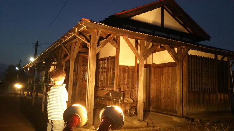 9月15日、羽前成田駅をライトアップする実験を行いました。会員から灯光器を貸してもらい、設置台も会員の手作り。夕方5時から7時まで、映し出される駅舎の表情は、時間と共に様々に変化します。写真に詳しい会員から、「日没から30分ぐらいが、空が青くなって映りが良い時間帯だ。」と教えてもらう。なるほど、それで寝台特急トワイライトか、と納得。イルミネーションの灯りを見て来ましたが、こうしたライトアップは初めて。木造駅舎の新たな魅力を再発見できました。これからの事業の参考にしたいものです。