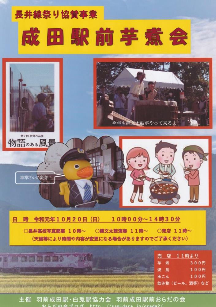 10月20日に行われる長井線祭り・成田駅会場のチラシができました。(いかにもダサい仕上がりですがご勘弁を。) 今年も縄文太鼓の演奏をお願いしています。今年で35回になる縄文祭りは10月13日(日)11時から15時まで、長井市西根地区の古代の丘で開催されます。縄文遺跡群の中で演奏される太鼓の響きは、聞く人を縄文の世界へと誘います。成田駅での演奏も本場・古代の丘での演奏も、どちらもお楽しみください。 縄文祭りの動画はこちら ⇒ https://www.youtube.com/watch?v=BEJQeyktWrE