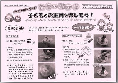 子育ての悩みや家庭教育などの問題について学び、情報交換を行うお茶の間交信。今年度第4号を発行しました。今回は、お正月のおうち時間を家族で楽しむ工作や絵本を紹介しています。 お茶の間交信は保育の専門家を中心とした編集委員と、子育て中の読者の皆さんで作りあげる情報紙です。ご感想、ご意見を返信としてどんどんお寄せ下さい。メールでも結構です。 お茶の間交信(No.224)はこちらから(PDF)