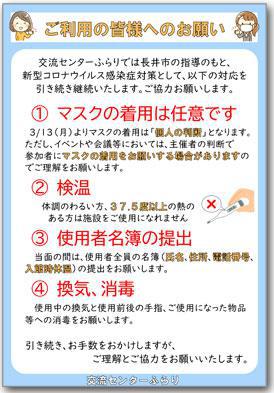 交流センターふらりでは長井市の指導のもと、 新型コロナウイルス感染症対策として、以下の対応を 引き続き継続いたします。ご協力お願いします。※現在は使用人数の制限はありません。お手数をおかけしますが、 ご理解とご協力をお願いいたします。 @ マスクの着用は任意です 3/13(月)よりマスクの着用は「個人の判断」となります。 ただし、イベントや会議等においては、主催者の判断で参加者にマスクの着用をお願いする場合がありますのでご理解をお願いします。 A 検温体調の悪い方、37.5度以上の熱のある方は施設をご使用になれません。 B 使用者名簿の提出当面の間は、使用者全員の名簿(氏名、住所、電話番号、入館時体温)の提出をお願いします。 C 換気、消毒 使用中の換気と使用前後の手指、ご使用になった物品等への消毒をお願いします。 新型コロナウイルス感染症の状況により、使用制限や使用の条件が変更になる場合が ありますので、ご予約の際はお電話でご確認ください。 (お問合せフォームからの予約は受け付けておりません。) 施設使用についての問い合わせ:長井市中央コミュニティセンター 電話0238-84-5868(時間9:00〜21:30 ※火曜日・日曜日、祝日は17:00まで) 施設の使用について(PDF) Instagramはこちら