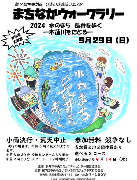 【開催決定】本日のいきいき交流フェスタ「まちなかウォークラリー」は、予定通り開催します。8時30分より受付を開始します。参加者のみなさま、スタッフのみなさま、どうぞよろしくお願いします! 【参加者募集】 ※申し込みは終了しました第7回中央地区いきいき交流フェスタ「まちなかウォークラリー」を今年も開催します。今回のコースは水のまち・長井の木蓮川をたどります。4.3kmのAコースと5.2kmのBコースです。地域のグループで、お友だち同士で、職場の同僚と一緒に、どんなチームでも大歓迎です。ぜひご参加ください。 「まちなかウォークラリー2024 水のまち 長井を歩く〜木蓮川をたどる〜」日時:9月29日(日)午前8時30分集合/午前9時20分スタート参加無料(競争なし)申し込み:・年齢不問。3〜4人程度のグループでお申し込みください。・グループの中に長井市在住、もしくは長井市出身者がいればどなたでもOKです。・小中高校生のグループでも大丈夫。(小学生は保護者1名以上同伴)・地区単位での参加は団体賞の対象となります。・お申し込みは、電話、ファックス、Eメール、申込フォーム をご利用ください。申し込み締め切り:9月19日(木)・お申し込みいただいた方には後日、詳しい案内を郵送します。 詳しくはこちらから(PDF)お申し込みはこちらから(申込フォーム) Instagramはこちら