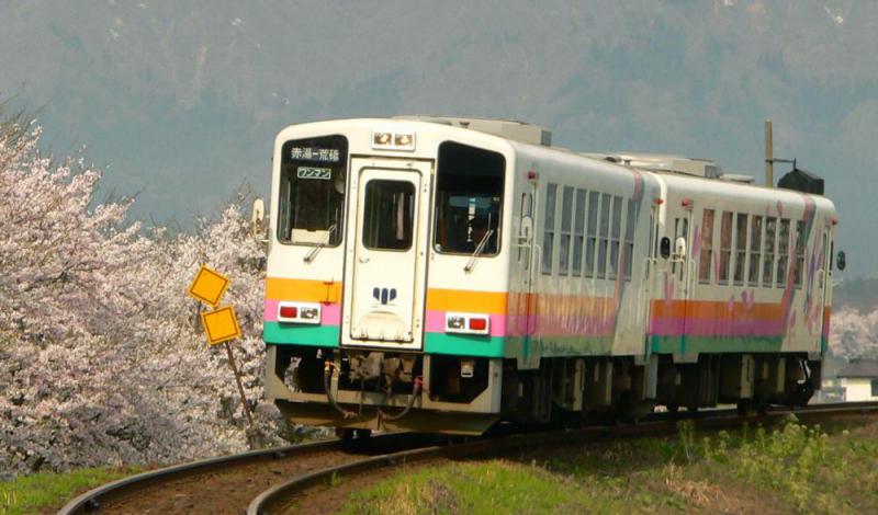 あやめ公園付近を通るフラワー長井線、満開の桜の下を走ります。