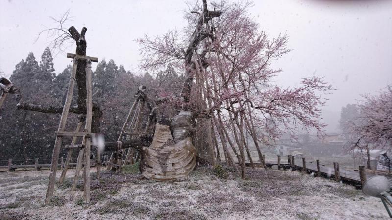▼4月11日 突然の雪に、咲初めの”久保桜”、震えています。
