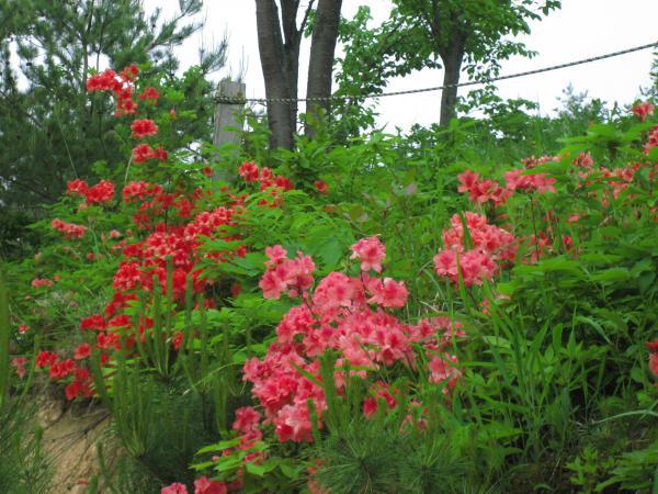 4月フットパスウォークに参加したとき、北八ヶ森に『ヒメサユリの丘』の案内板が立っていたのを思い出し出かけてみた。時期が早すぎたのか『‐‐‐‐の丘』というほどヒメサユリの姿は見えず再度出直しということになったのだが、数株見えたヒメサユリのうすいピンクの花は楚々とした風情があって‐‐‐‐咲きそろったときはさぞや‐‐‐‐と期待を持たせてくれた。かわりに楽しませてくれたのがヤマツツジの花。現在のところ群生というには今一歩というところだが、数年先には山全体がヤマツツジの赤におおわれるに違いないと期待を持たせる勢いだ。30年以上の時間をかけて整備に取り組んできた地区を挙げての努力の効果が目に見えてきたということだろう。ちなみに今年度1回目の下刈り作業が6月12日早朝に予定されている。