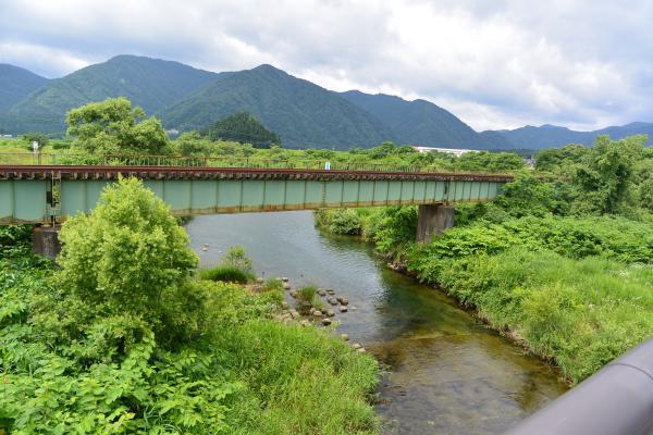 最上白川にはこの白川橋と並行して陸羽東線の鉄橋が架かっている。地図によると白川橋から国道47号を2kmほど下流へ走って左に入ると小国川の左岸に出られ、大堀地区の養護施設の近辺から流入点を正面から見られそうだ。大堀の最上西公園から見おろす小国川は絶景だ。確かアユ釣りの名所のはずだ。しかし残念ながら流入点とおぼしきあたりは鬱蒼としたスギ林の急斜面で立ち入れそうにない。右岸からのアプローチを試みた。田んぼの間のトラクター道路のような砂利道を走り流入点に近づいた。堤防をおりるとすぐに葦などの水辺の丈の高い植物の茂みが始まり、足元まで水が来ている。流入点には我が白川のような河川敷や広い河原が存在しないのだ。葦の葉先越しに水面が辛うじて見えるのみである。長靴の準備もなく流れに入るのを断念した。流入点付近を除けばよく手入れされているし、渓流公園やキャンプ場の設備などが設置されていたり、水はきれいだし、最上白川が地域の人に親しまれ大事にされていることが伝わってきてうれしくなった。わたしたちも白川という自然の贈り物を誇りに思い、大切にして子や孫の世代へ引き継いでいかなければならないと改めて感じ入った次第の顛末。出かけたついでとはいえ、準備が周到でなかったことは大いなる反省点。