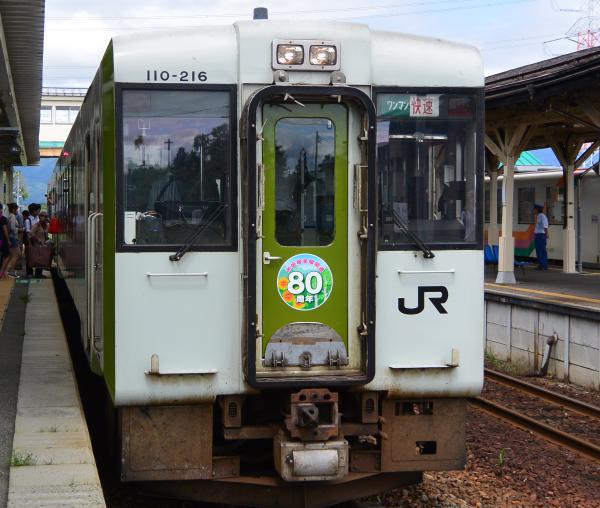 米坂線 全線が開通して80周年だそうだ。記念のヘッドマークを付けた列車にエールを送ろうという催しに参加して、手を振ってきた。参加者は30人ぐらいかな?横断幕を掲げて快速「べにばな」米沢行きを待った。米坂線は1926年9月米沢〜今泉間(23km)が開通し、その後今泉と坂町から小国へ向けて順次延伸し、1936年8月31日小国〜越後金丸間が開通して全通となったのだとか。今泉〜坂町間の距離は70km弱程度だが、敷設に当たった時代背景(昭和初期)と区間の半分が豪雪山間地域であることを考えると、信じられないほどの短期間でと感服してしまう。列車が入ってきた。快速「べにばな」の前身はたしか急行「あさひ」といったはずだ。仙台〜山形〜新潟を結ぶ都市間連絡急行として重要な役割を期待されて1960年に運行開始した列車だ。東北、上越、山形新幹線の登場、モータリゼーションの発達に押されて、今ではローカル快速列車になってしまったが、最盛期は1日2運行で内1回は5両編成の人気列車だった。「あさひ」はいま上越新幹線にその名をとどめる。今日の列車は往年のように乗客がたくさん乗っている。恥ずかしがらずに手を振ろう。バーニック、ベニちゃん、モッチー駅長もエールを送りにきてくれた。米坂線といえば「蒸気機関車」「キマロキ編成」「坂町乗り換え」「サカセン」等々、いろいろな単語が浮かんでくる。それはまた別の機会に・・・・
