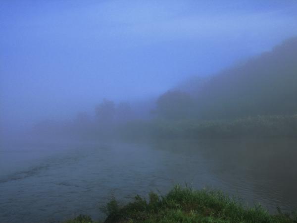 この秋一番の寒さの朝、がんばって散歩に出た。サムい! 半袖1枚ではもうムリだ。朝6時。濃霧が立ち込め、100メートル先がかすかに見えるだけ。霧がない時と比較してミッペ。 6時半、白・松の合流点の対岸はこうなる。対岸までの距離は同じく100メートルぐらい。 白川の上流側を振り返るとこうだ。いつもは水辺でエサをねらうサギをよく見かけるのに・・・これではまるで川中島ではないか。 霧が晴れてみたら、流れの向こうに上杉の大軍が対峙していた。・・・武田信玄もタマゲタベナぁ・・・これからの季節、気がついたら目の前に対向車がいて「吃驚也!牛!」なんてことにならないよう、用心スッペ!