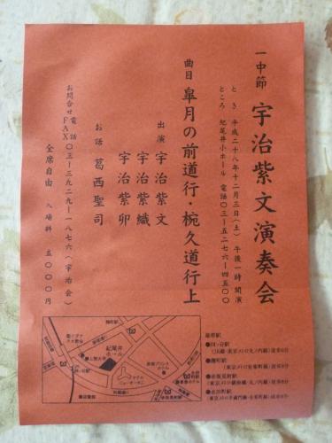 宇治紫文さんの年1回だけのリサイタルが下記の通り開かれます。 と き 平成28年12月3日(土) 午後1時開演 ところ 東京都千代田区紀尾井町 「紀尾井小ホール」? 03−5276−4500 曲目 皐月の前道行 椀久道行上 出演 宇治紫文 宇治紫織 宇治紫卯 お話 葛西誠司(※元NHKアナウンサー。古典芸能に第1人者) お問い合わせ ?・FAX 03−3929−1876(宇治会) 全席自由 入場料 5,000円最寄駅四ツ谷駅 (JR線・丸の内線・南北線)麹町口徒歩6分麹町駅 2番出口 (有楽町線)徒歩8分赤坂見附駅 D出口 (銀座線・丸の内線)徒歩8分永田町駅 7番出口 (半蔵門線・有楽町線)徒歩8分○ホールは、ホテルニューオータニ ザ・メイン(本館)の向いにあります。○通常のアクセス地図では、各駅の地上出口付近からのおおよその徒歩所要時間をお知らせしていますが、改札と地上出口が離れている場合も多いので、以下のご案内では、各出口最寄りの改札からホールまでの所要時間の目安を記しました。徒歩は分速80m(時速4.8q)を基準にしました。※チラシが不鮮明なので上記に略記しました。また、葛西さん紹介の一部は、ネット情報です。)