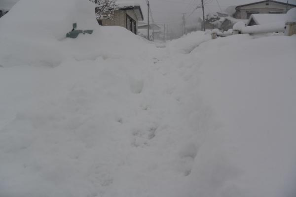 よく降る。去年は 少雪だったからか、こんなこと気にならなかった。写真は我が家の前の『県道161今泉停車場線』。7時30分頃に30人前後の子どもたちが登校していった後の歩道の様子だ。大人の足のくるぶしのあたりまでだから、積雪は10cmぐらい。それでも小さな子どもには楽な条件ではない。吹き溜まりだってあるだろう。以前は、登校時には歩道に除雪車が入っていたと思うのだが・・・記憶違いだべか?人力除雪車しかない偏屈老人は自宅の前の雪をどけるだけで精いっぱい。「ごめんね、気を付けてね、行ってらっしゃい」に、「はーい、行ってきまーす」の声がけなげですがすがしかった。ちなみに『国道287号』も同様だった。なんとかならないもんだべか?それにしてもよく降る。
