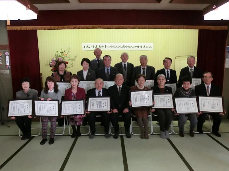 長年にわたり福祉向上のために功績のあった方々に対し、表彰の授与がありました。平成27年度当市で受賞された方々は、次の通りです。受賞おめでとうございます!第65回 山形県・県民福祉大会表彰★県知事表彰 社会福祉事業従事者 従事者 根津 昌子 様 (山形県社会福祉事業団) 皆川 善典 様 (特別養護老人ホーム:慈光園) 斉藤 博幸 様 (特別養護老人ホーム:慈光園) 情野 明美 様 (特別養護老人ホーム:慈光園) 富永 一史 様 (特別養護老人ホーム:慈光園) 志釜 幸喜 様 (特別養護老人ホーム:慈光園) 橋本 文子 様 (特別養護老人ホーム:慈光園) 舟山 悦子 様 (特別養護老人ホーム:慈光園) 樋口富士子 様 (特別養護老人ホーム:慈光園) ★大会会長表彰 社会福祉事業協助・奉仕者 (団体) 民謡町田会 様 長井傾聴ボランティア「なごみ」 様 ★山形県社会福祉協議会会長感謝状 県社協賛助会員 (団体) 株式会社 北原産業 様平成27年度長井市社会福祉協議会会長表彰および感謝状★社会福祉功労者表彰(順不同) 横澤 要 様 【中伊佐沢】 (高齢者の交流及び福祉活動) 外田 博貴 様 【栄 町】 (社会福祉法人役員) 菅野 英夫 様 【本 町】 (社会福祉法人役員) 齋藤 喜内 様 【東 町】 (社会福祉法人役員) 渡部 昭子 様 【上伊佐沢】 (ミニデイサービス「館久保わかまつ」協力員) 佐藤 啓子 様 【上伊佐沢】 (ミニデイサービス「館久保わかまつ」協力員) 土田 晃 様 【花作町】 (ミニデイサービス「花の和会」協力員) 渡部 俊雄 様 【九野本】 (ミニデイサービス「八雲おたっしゃクラブ」役員) 赤間 冨子 様 【平 山】 (ミニデイサービス「下平山ミニデイ」協力員) 佐藤 淑子 様 【平 山】 (ミニデイサービス「下平山ミニデイ」協力員) 梅村さだ子 様 【平 山】 (ミニデイサービス「下平山ミニデイ」協力員) 安部 トヨ 様 【平 山】 (ミニデイサービス「下平山ミニデイ」協力員) 藤川 シゲ 様 【九野本】 (ミニデイサービス「すこやかクラブひらの」協力員) 小笠原みち子様 【九野本】 (ミニデイサービス「すこやかクラブひらの」協力員) 佐藤 絹子 様 【九野本】 (ミニデイサービス「すこやかクラブひらの」協力員) 大谷部秀昭 様 【飯豊町】 (障がい者の相談や社会復帰に貢献) ミニデイサービス「和泉寿会」 様 ミニデイサービス「下平山ミニデイひまわり」 様 ミニデイサービス「花の和会」 様 ミニデイサービス「ミニデー葉山会」 様 ★社会福祉功労者感謝状 菊地 榮 様 【幸 町】 (社会福祉事業への寄付)