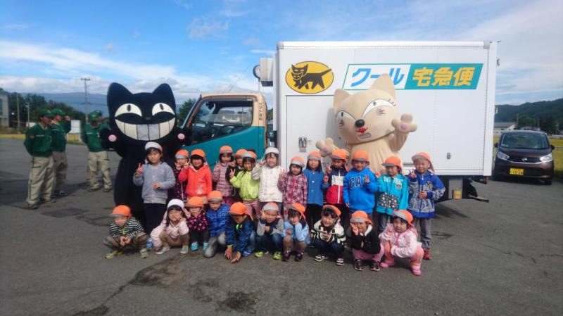 秋空の下、いっぱいいっぱい交通安全体験しました! 今月のかもしかクラブに、「ヤマト運輸」 のみなさんが交通安全の先生として来てくださいました! まずは、「横断歩道を渡るとき、どのあたりに立つのが正しいかな?」をみんなで考えました。 「道路に近すぎると、トラックとぶつかりそうになる!!」 「もっとこっちこっち!!」年長さんが代表でお人形を置きます。 車に巻き込まれる事故等にあわないように、道路から5歩離れたところに立って待つことを学びました! 次に、いつもの「ストップのお約束」からの→トラックの運転席に乗車!トラックの高い運転席からは小さい子どもは見つけにくいこと、トラックの乗り心地はものすごくイイことを学びました! なんと、トラックの荷台にまで乗せてもらっちゃいました! この他にも、紙芝居を読んでくださったり、寸劇を交えたわかりやすい交通安全のお話もありました。子ども達はもちろん、かもしかのお母さん達も先生方も、ものすごく勉強になりました! 最後に、お勉強を頑張った子ども達にご褒美までいただきました。 ヤマト運輸のみなさん、本当にありがとうございました!!