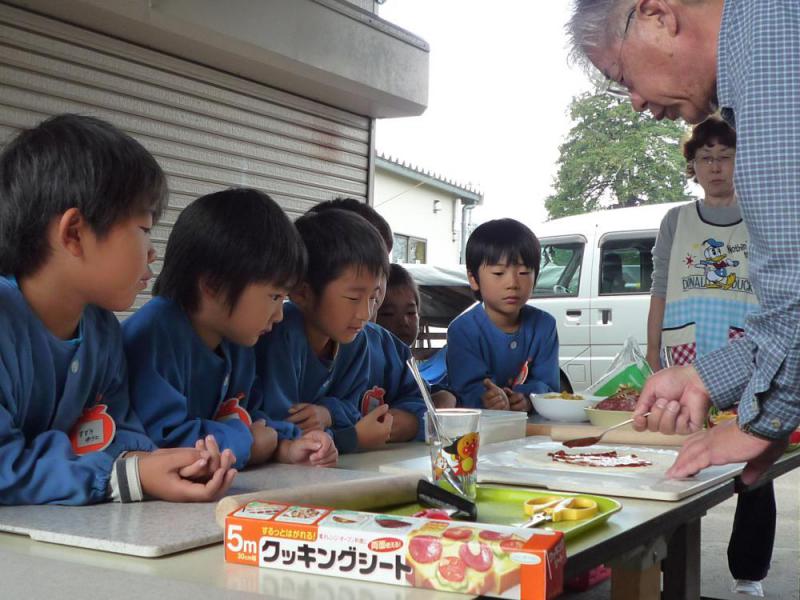 致芳地区公民館長さん宅の本格窯で、本格ピザ作りを体験しました! 年長児が2日間に分かれて、初めてのピザ作り!美味しくなるように、生地(ピザドウ)を薄くまーるくのばして、ピザソースを塗り、玉ねぎ・ピーマン・コーン・サラミ・チーズのせます。 館長自慢のピザ釜に入れれば、1分位で出来上がり★自分で作ったピザ!今まで食べた中で1番の美味しさでした!ほとんどの子が、1枚ぺろりと食べました。恒例の館長のピザ焼き。年長児だ〜けのお楽しみです(●´д‘●)」ごちそうさまでした!!