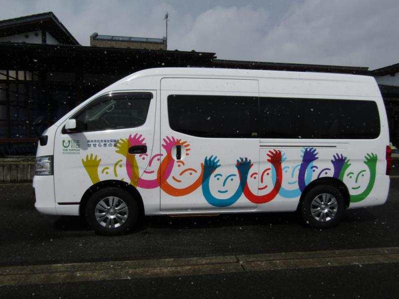 送迎用として車いすが2台も乗せられる、福祉車両を 公益財団法人日本財団様からの助成を受けて、購入することができました。足腰の不自由な方でも楽に乗降ができるため、今後有効に使用していきたいと考えています。山形新聞に記事を載せていただきました