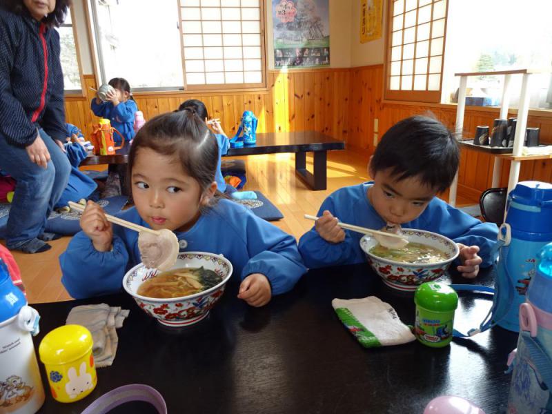 楽しかったヨ!おいしかったヨ!@最初は、「伊佐沢学童クラブ」にいったよ! 新しくて、まだ木のにおいがしました。 トイレに入ると、自動で電気がついてビックリ!A次に、「伊佐沢小学校」に行ったよ! グランドをぐるっとひと周り。グランドから道路に上がる 所に、年に2回咲く桜が咲いていました!冬なのにスゴイなぁ。 「秋彼桜(あきひざくら)」というそうです。Bお次は「伊佐沢地区公民館」! ホールで、魚つり・輪投げ・めんこ・おはじきで遊ばせて もらいました。お土産にさくらんぼポッキーまでいただき、 ありがとうございました!Cいよいよメイン、ラーメン「わこう庵」へ! あつあつのラーメンを「ふーふー」して食べました! みんなで食べるとおいしいねぇー。 自然と笑顔になっています…( *´艸`) なんとデザートにプリンをサービスしていただきました。 満腹になったところで、ラーメンツアー終了!! あぁ〜おいしかった!また行きたいなぁー(*'▽')