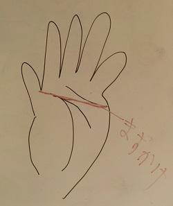 12月21日(木)、定期交流会でヨガを教えてもらっている小松先生をお迎えして、今回は「手相で出会った忘れられない話」「楽しいとこどりの手相占い」の話を聞きながら、お茶会をしました。世界140か国を旅した様々なエピソードの中から、今回はアメリカのフロリダやロサンゼルス、タイに行ったときの忘れられない話をしてくださいました。フロリダではフリーマーケットに何回か参加し、65か国・6000人の手相を見たそうです。先生は「手相はツールで、だんだん人生相談になってくる。」と話していました。手相は世界共通で、線も変わるそうです。ペンで書き足してもいいと聞き、驚きました。また、左右の手相には意味があり、それぞれ違うとのことで、左手の線は親から与えられたもの、右手の線は自分で切り開いていく線だそうです。上の手相の写真にある赤い線は「ますかけ線」と言って珍しい線で何かを成し遂げる人にあるそうです。お茶会後は簡単なヨガを教えてもらい、身体もほぐれて心身共にリラックスできました。ヨガのあとは、先生から手相も見てもらいました。昼食はアトリエ・パッションの3種類のパスタを軽食として用意し、みんなで分けて食べました。参加者の方が自家製の漬物を持ってきてくださり、一緒においしく頂きました。食事中も話は尽きず、かわいい参加者さんも来てくれて、ほんわかとした時間を過ごしました。11月の避難者交流会の記事「講演会といも煮交流会」はこちら
