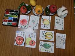 1月25日(木)、吉野先生のご指導のもと、初めて絵手紙に挑戦してみました。 最初は篆刻用消しゴムで自分の落款(らっかん)印を彫りました。これは、案外簡単にできました。 ★用意するもの★ 篆刻用消しゴム印、白い紙、4Bの鉛筆、つま楊枝、朱肉 1 白い紙に消しゴム印の周囲をなぞり□の枠をつくる。2 枠の中に掘りたい文字(ひらがな)1文字を鉛筆で強めに書く。3 消しゴム印に紙を押しつけ、版面に文字を写し取る。(逆さ文字になる)4 彫り易いように文字をサインペンでなぞる。5 つまようじで文字の部分を削る。6 朱肉で試し押しをして、細かい部分を修正する。 これで自分だけの落款(らっかん)ができました。なんだかちょっと、うれしい気持ちになりました。 次にはがきに筆で絵を描きました(絵手紙)。★用意するもの★画材、墨、筆、筆洗い容器、顔彩(絵具)、はがき 墨は絵手紙用の墨汁(一滴絵手紙など)もありますが、先生は心が落ち着くからと自分で硯ですった墨を使っているそうです。 画材はリンゴ、ピーマン、パプリカ、キノコ、カボチャなど表面に凸凹があるものを用意し、その中から自分の書きたいものを選び、下書きはしないで直接はがきに描きます。初めに筆で輪郭を書き、顔彩で色付けします。 絵が描き終わったら、言葉を書きます。なんでもいいので、必ず書くようにします。 完成したら大事にしまっておかず、家族でも、友人でも誰でもいいので必ず出すこと。そうすることで、付き合いの輪がひろがり、楽しくなるとのことでした。 2時間弱の時間でしたが、落款印を彫り、絵手紙を3枚も描きました。 最初はどうなる事かと皆さん心配そうでしたが、だんだんと慣れてきて、自分の感性を生かした絵や言葉を書いた絵手紙が出来上がり、「これは誰に出そうかな。」と楽しみが広がっているように思えました。 最後に先生の作品をみせてもらいながら、お茶を飲んで終わりました。とても勉強になった、楽しい交流会でした。1月の避難者支援の記事「〜お茶会&簡単ヨガ体操交流会をしました〜」はこちら