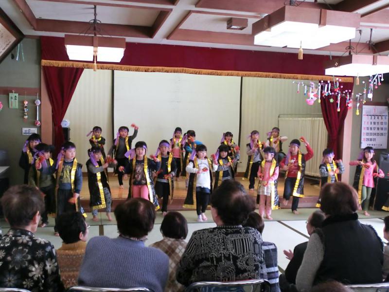 ふれあいサロンと豊田児童センターが、交流会を行いました 毎年恒例となりましたこの交流会、サロン利用者の方の喜ぶ笑顔が見たくて、もちろん今年も企画しました! 今年の出番は、豊田児童センター!年長さんを筆頭に、年中さん、年少さん2歳児さんが雪の中サロンに遊びに来てくれました。◆2歳児「げんきげんきノンタン!」◆◆年少児「やってみよう」◆◆年中児「エビカニクス」◆◆年長児「よさこいメドレーよっちょれ乱舞」◆ 大広間に子どもが入ってきた途端、利用者からは大きな歓声が!自然と手拍子も出て、子ども達を大いに盛り上げてくれました。 子ども達による「手作りしおり」のプレゼントをもらった利用者さんは、終始笑顔(*'▽') サロン事業と保育事業を行う当社協ならではの、微笑ましい光景でした!来年もまた、遊びに来てねー!!