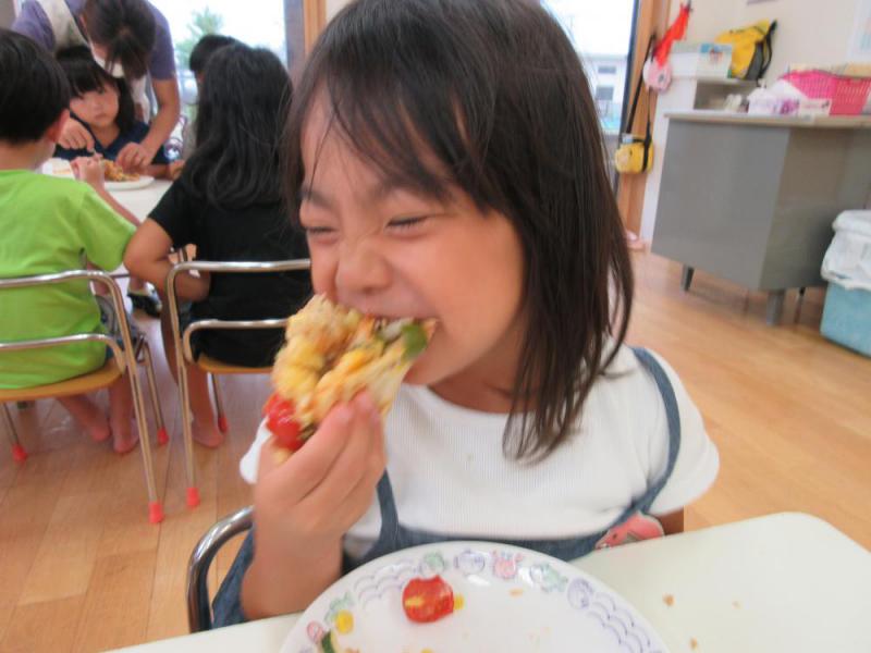 食育活動の一環として料理に挑戦しています これまでも、クッキーやカレー作りをしてきましたが、今回は野菜たっぷりピザ作りに挑戦しました!!↓ まずは下ごしらえ 毎年、自分たちの畑で収穫した野菜を使って作るのですが、今年は雨がなかなか降らず収穫できませんでした…。(残念!) 野菜を切って、並べて、チーズもトッピング! とても真剣な顔の子ども達( *´艸`) 山もりの特製ピザが出来上がりました!! みんなで作って食べると、おいしさも2倍3倍! 次は何を作ろうかなぁー…。〈保育施設の活動アルバムはコチラをごらんください〉