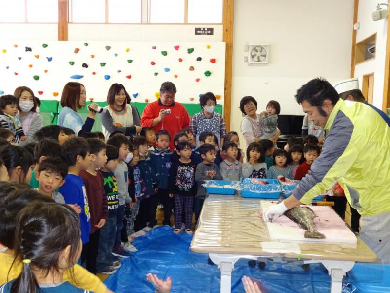 田中鮮魚店様のご協力により、お魚の勉強会をしました! 今年初めて企画した、「お魚の勉強会」! じかに生き物に触れて欲しい、食の大切さを知って欲しいといった職員の熱い思いから実現しました。 講師は皆さんご存知、田中鮮魚店の田中金雄さん。テーブルがいっっぱいになるほどのお魚を並べ、いざ勉強会がスタート!!「給食や食卓にお魚が出て、みんなのお口に入るまで、どうやって海からお魚は来るんだろうね…。」との問いかけから始まりました。 海で釣る人、市場でさばく人、お店で売る人、料理を作る人…。たくさんの人の手によって、みんなのお口まで届いていることを知った子ども達。 魚にも感謝、携わった多くの人にも感謝、その気持ちを大切にしておいしくいただこうと教えて頂きました。とっても大事なこと、きっと子ども達にも伝わったはずです…。 その後、いよいよ会食タイム! 今日のメニューは栄養満点の「タラ汁」です。 年長さんが、野菜を切ってお手伝い。先生にコツを聞きながら、頑張って切ってくれました。新鮮なお魚と、年長さんが切手くれたお野菜、そして田中さんの愛情がたっぷり入ったお鍋は、このうえない絶品鍋に!! 家に帰って、お家の方に教えてくれたお子さんも沢山いたようで、反響もかなりあったようです。今後もこのような機会を設け、子どもの成長に携わっていきたいと思います。 田中さん、お忙しいところありがとうございました!!