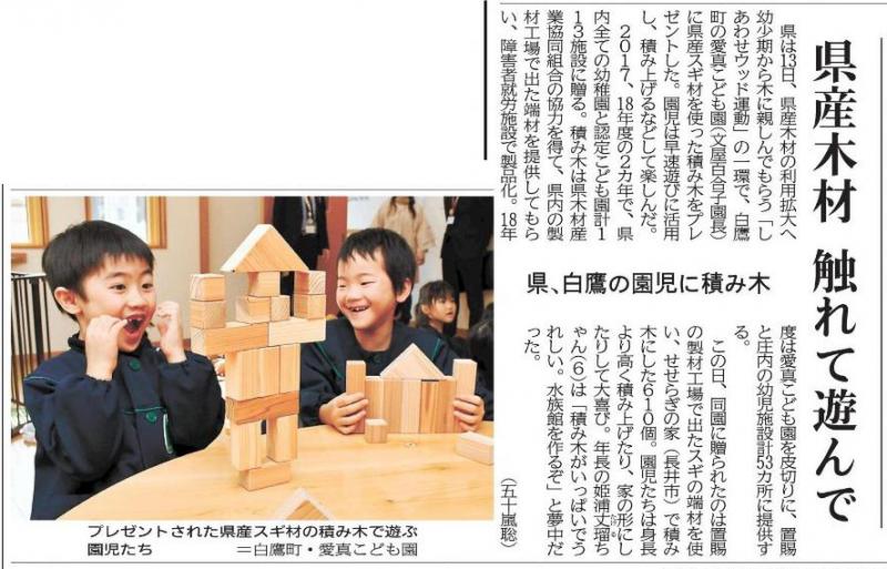 2月13日に白鷹町の「愛真こども園」で積み木のセットの贈呈式がありました。県内の幼児施設に、県内産の木材で作った積み木が、山形県からプレゼントされました。この加工をたのまれたのが、せせらぎの家です。利用者の手によって、きれいに作られた積み木で遊ぶ子供たちの笑顔は本当に楽しそうでした。(山形新聞 2月14日記事より)