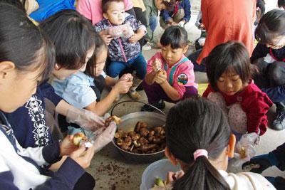 畑をシェアして活動している共育セミナーなかよしくらぶと親子チャレンジ教室 畑の楽耕の合同芋煮会が古代の丘で行われました。当日は畑の楽耕の小学生たちを中心に活動しました。 ▽開会行事 それぞれの活動で育てた里芋を収穫しての芋煮会です。 ▽まずは全員で里芋の皮をむく作業からスタート ▽火起こしやかまどの管理は小学生の男の子が行いました ▽小学生の女の子と男の子、そして大人の鍋を準備し、それぞれが味付けしました 火の調節をしたり、あくをとったり、小学生が中心となってがんばります。芋や大根をじっくりと煮る間は、虫を追いかけたり、卵を見つけたり、みんなで体を動かして遊びました。 ▽小雨まじりの肌寒い天気でしたが、子どもたちは元気いっぱい! 自然の中で遊びつつ、お父さんやお母さんに手伝ってもらいながら味付けや味見を繰り返し、ついにいも煮が完成です! ▽いっただきま〜す! ▽3つの鍋とも美味しそうに出来上がりました ▽たくさんの家族に参加してもらい、みんなで美味しくいも煮を食べました。 ▽おなかがいっぱいになった後も、楽しそうに遊んでいました。 。°+°。°+ °。°。°+°。°+ °。°。°+°。°+ °。°+ °。° なかよしくらぶと畑の楽耕では、合同芋煮会のために、それぞれの畑で収穫を行いました。 ▽なかよしくらぶでは就園前のお友達が、絵本で野菜の勉強をして、畑でも作業をがんばりました。 ▽サポーターの皆さんやお家の人と一緒に作業も一生懸命です。 ▽畑の楽耕の小学生たちも芋煮会の前日に収穫を頑張りました ▽作業後のお楽しみ会ではかぼちゃのニョッキやババロアを作りました ▽ニョッキ作りで手が!! ▽美味しくできました