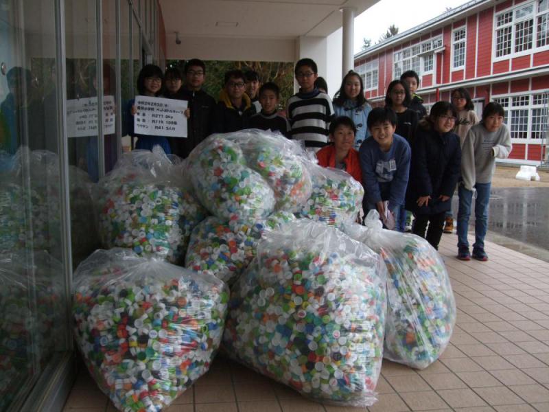 《写真は長井小学校赤十字委員会のみなさんと回収されたペットボトルキャップ》令和2年2月10日(月)長井小学校体育館で「車椅子・ペットボトルキャップ贈呈式」が行われました。長井市社会福祉協議会からは佐藤事務局長が出席し回収されたペットボトルキャップが、どのように役に立つのか、昨年度からの回収量等をお話させていただきました。長井小学校様では、地域の方々・家族の協力を得てアルミ缶回収、昨年度からは回収されたキャップがワクチンにかわる、「ペットボトルキャップ回収運動」にも取り組んでおられます。昨年度、キャップ受取りの相談が長井小学校様からあり、長井市ボランティアセンターでお受けすることにさせていただきました。集められたキャップは山形銀行長井支店様のご協力をいただき、福島県西白河郡のサンケミカル様に送られております。送られたキャップは選別・袋詰めされ成型会社に売却し、得たお金を「世界の子どもにワクチンを日本委員会(JCV)」に寄付し、寄付金で購入したワクチンを「国連児童基金(ユニセフ)」を経由して世界の開発途上国の子ども達に届けられます。令和2年度の回収量は重量:約277.0kg個数:約119,100個(一人当たり196個)ワクチン:約41.5人分 でした。昨年度からの合計では重量:約476.7kg個数:204,970個(昨年度は一人当たり141個)ワクチン:71.4人分になりました。長井小学校様が回収した量は、長井市社会福祉協議会でデータを取り始めた平成26年4月からの累計の、なんと29%に相当します。1年間の活動を通して回収された多くのペットボトルキャップありがとうございました。