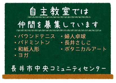 中央コミセンの学習ひろば自主教室では、地域のみなさんが様々な活動に取り組んでいます。現在は7つの教室があります。新型コロナウィルス感染症の影響でお休みしていましたが、6月から少しずつ活動を再開しています。活動に興味のある方は中央コミセン(電話0238-84-5869)までご連絡ください。活動日:毎週木曜日 午前9時〜正午/毎週日曜日 午後1時〜4時どこで:長井市民体育館(交流センターふらり2階)入会金:2,000円年会費:6,000円活動日:毎週水曜日 午前10時〜正午/毎週日曜日 午前10時〜正午どこで:長井市民体育館(交流センターふらり2階)対 象:どなたでも活動日:第1・第2月曜日 午前9時30分〜正午どこで:交流センターふらり対 象:どなたでも活動日:第1・第3木曜日 午後7時30分〜9時どこで:交流センターふらり会 費:月1,000円活動日:毎週木曜日 午前10時〜正午どこで:交流センターふらり対 象:どなたでも活動日:第1・第3金曜日 午前10時〜正午(6月〜10月の10回講座)どこで:交流センターふらり年会費:3,000円(材料代別途)活動日:第3日曜日 午前10時〜正午 (年8回 8月、12〜2月をのぞく)どこで:交流センターふらり講 師:杉崎紀世彦氏、杉崎文子氏会 費:12,000円