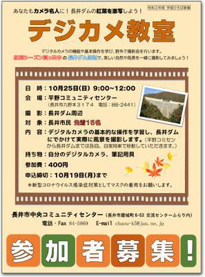 ※この事業は終了しました。ご参加いただいた皆様、ありがとうございました。 学習ひろば「デジカメ教室」を今年も開催します!デジタルカメラの機能や基本操作を学び、紅葉シーズン真っただ中の長井ダム周辺を撮影します。あなたもカメラ名人になりましょう!ぜひご参加ください。 日 時:10月25日(日) 9:00〜12:00会 場:平野コミュニティセンター (長井市九野本3174-1) 撮 影:長井ダム周辺 対 象:長井市民 内 容:デジタルカメラの基本的な操作を学習し、長井ダム にでかけて実際に風景を撮影します。(平野コミセン から長井ダムまでは各自、自家用車で移動していただきます。) 持ち物:自分のデジタルカメラ、筆記用具参加費:400円 申込締切:10月19日(月)まで *新型コロナウイルス感染症対策としてマスクの着用をお願いします。 長井市中央コミュニティセンター(長井市屋城町 6-53 交流センターふらり内)電話・Fax 84-5869 E-mail chuou-k5@jan.ne.jp 詳しくはこちらから(チラシ・PDF)