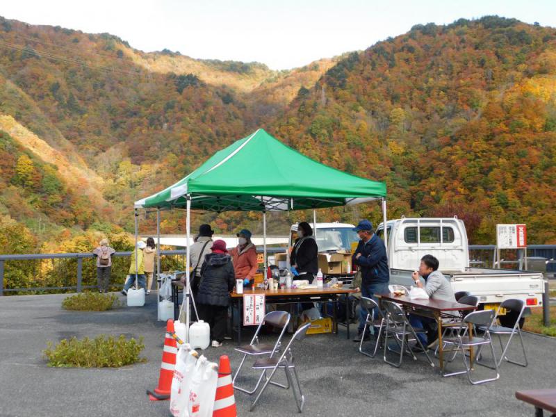 ながいダム百秋湖まつりに平野コミセンが出店しました。玉コンニャク良し!豚汁良し!、笑顔 よし! もちろん紅葉良し!