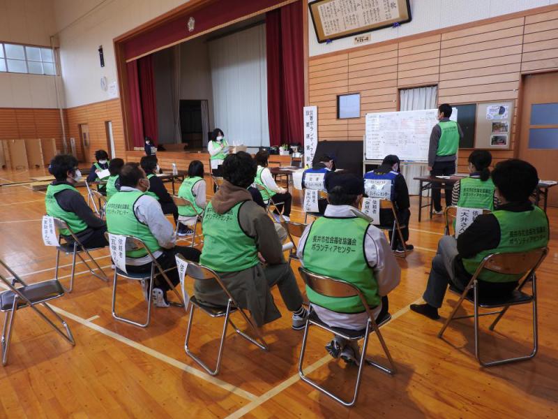 10月25日(日)長井市総合防災訓練が伊佐沢小学校周辺を会場に行われ、長井市地域づくり推進課様・長井市社会福祉協議会では「災害VC設置運営訓練」を行いました。最近、頻繁に発生する自然災害に備え、災害VCについての知識を深め、円滑な設置・運営に向けた体制づくりを推進するために例年訓練を行っております。今年度はコロナ禍の中で人数制限をしての訓練になりましたが、長井市社協職員・地域づくり推進課様のほか災害VCメンバーの長井青年会議所様、ボランティアコーディネーター様をはじめ17名の方に参加いただきました。運営側は受付班、ニーズ班、マッチング班、資機材班とボランティア側に役割分担を行い実施しました。災害VC長(金田事務局長)あいさつ(写真左)と訓練内容・日程説明(写真右) 受付班(ボランティアの受付。申込書記入・確認を行いボランティア保険に未加入の方がおられれば加入手続きを行います)ボランティア申込みは、団体は原則事前申込みとし個人は当日申込みも大丈夫という設定で行いました。 マッチング班(ニーズとボランティアのマッチングを行います。活動での注意点等をボランティアに説明し、活動終了後は、終了か継続か確認し次の日のマッチングに反映します)ニーズが7件上がっており、4団体のボランティア38名、個人3名のマッチングをする訓練を行いました 資機材班(活動依頼書兼報告書に記載されている必要な資機材を準備します)マッチング班から活動の内容・資機材数等の説明を受けた後(写真左)、資機材班に移動し必要な資機材を受取ります(写真右) 活動のふり返り各担当班から良かった点・改善が必要な点を出し合いました 受付班からは、*事前申込みいただいた団体はスムーズに受付を完了できたが、個人での当日申込みには時間がかかってしまった。*ボランティアさんの人数変更があった時に、マッチング班への報告が遅れた等 マッチング班からは、*ボランティア人数変更時の、資機材班への連絡がスムーズにできた*ボランティアさんへの説明にもれがあった。配布する一覧表があればいいと思った等資機材班からは、*受け渡しがスムーズにできた*在庫チェックに時間がかかった等ボランティア役からは、*団体受付がスムーズだった*活動内容の説明もわかりやすかった*待機所での時間が長かった*運営側とボランティア役の区別をしたほうがいい等全体を通しての感想は、 *マニュアル通りに行くものではない。都度、見直しが必要である*担当者のスキルアップが必要である。定期的に訓練を行ってほしい等が上げられました。災害VC設置運営訓練に参加された皆様、大変お疲れさまでした。今回の訓練で出された改善点を見直しし、より良い体制づくりをしていきたいと思いますので、今後ともご協力・ご指導宜しくお願いいたします。ありがとうございました
