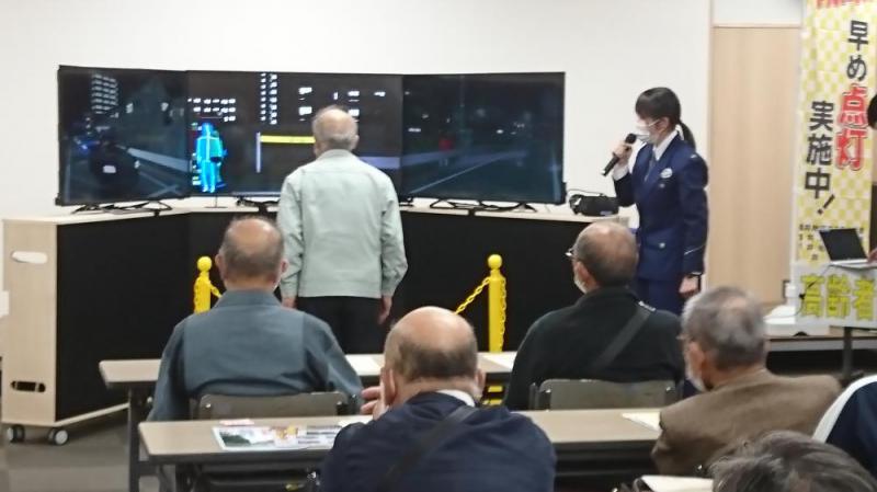 令和2年11月6日(金)長井市民文化会館を会場に開催された、「令和2年度 高齢者長生き交通安全実践教室」に長井市老人クラブ連合会から、コロナ禍で人数制限がある中、単位クラブ会長・交通安全推進員8名が参加し、交通事故防止対策等を学んできました。長井地区交通安全協会長 小松 要一 様 あいさつ令和2年10月末までは、長井署管内では発生件数・負傷者も減少しいい傾向が続いている。日の暮れが早くなるので薄暗くなる時間帯はできるだけ外出をひかえ、外出する時は、反射材の着用をお願いしたい。今回の実践教室の内容を地域に帰っても共有してもらいたい等のあいさつがありました。◎交通講話「高齢者の交通事故防止対策について」長井警察署交通課 佐藤係長様から交通事故の発生状況について詳しく説明いただきました。*怪我が軽症化している。スピードをだしていない・ルールが守られているのが要因に。*事故は、追突・出会いがしらが多く、車と二輪車(自転車含む)の事故が多くなってきている。自転車は1軒当たり1.53台を所有している。*7月から条例が制定され、保険加入が義務化へ。山形県は加入率21.9%で全国ワースト2位。頭部の怪我が60%を占めるので、義務ではないがヘルメットを着用してほしい。等の講話がありました。◎交通安全講習(新型危険予知シミュレーター体験」交通課 燻R主任・小野田係員から新型の道路横断体験装置を活用した講習をしていただきました。3台のモニターに映し出された映像を見て、足踏みをすれば前に進み、横から出てくる車があれば足踏みをやめれば停止するなどして、横断歩道をうまく渡る体験でした。視線の動きもわかり優れものでしたが、なかなかうまく渡れず周辺を良く見ることの大切さを知りました。 *横断時は、ドライバーの目を見て合図することで停止する車が増えるそうです。横断時の「ありがとう運動」も取り組んでいます。VR(Virtual,Reality:作られた仮想空間によって、現実のような体験ができる技術)体験もしました。※夕暮れ時は、早めの点灯で他車や歩行者・自転車に自車の存在を知らせましょう。※横断歩道は、歩行者優先です。信号機のない横断歩道は特に注意が必要です。 交通ルールを守り、交通事故にあわない、起こさないように心掛けましょう。