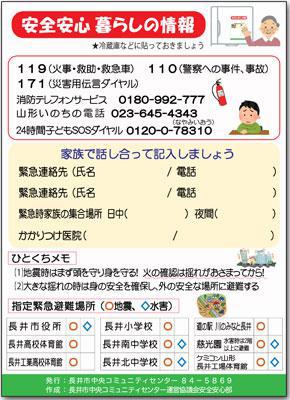 長井市中央コミュニティセンターでは安全安心専門部の事業として「安全安心暮らしの情報シート」を作りました。5月14日に中央地区の全戸に配布しています。住民のみなさんのお手元に届いたでしょうか。 このシートには災害時の公的な緊急連絡先や、避難所などの一覧を掲載しています。また、各家庭における緊急連絡先や家族の避難場所を記入する欄を作っていますので、災害に備えて家族で話し合っていただき、ご活用いただきたいと思います。 何度も貼って剥がせる特殊なシートになっていますので、冷蔵庫やガラス戸などに貼ってご利用ください。 ▽5月16日の山形新聞で取り上げていただきました
