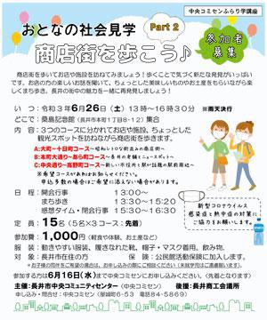 ※この事業は終了しました。ご参加ありがとうございました。 昨年12月に開催して好評だった「おとなの社会見学 商店街を歩こう♪」の第2弾を行います! お店の方の楽しいお話を聞いて、美味しいものをちょっと食べたり、お土産をもらったりしながら3つのコースに分かれて商店街を歩きます。歩くことで気づく新たな魅力を発見しながら、商店街を歩きましょう! 各コースとも街中の梅花藻スポットにも立ち寄る予定です。 参加希望の方は長井市中央コミセン(84-5869)までお申し込みください。 い つ:令和3年6月26日(土)午後1時〜4時30分 ※雨天決行どこで:桑島記念館(長井市本町1丁目8-12 本町商店街駐車場内)集合内 容:3つのコースに分かれて5つの店舗・施設を訪ねながら歩きます。 A:中央通り〜大町コース (化粧品の店シカマ、長沼合名会社、鍋屋本店、後藤屋肉店 ほか) B:本町大通り〜あら町コース (梅村呉服店、やまいち松龍園、鈴木薬局、WARMSTONE、サドヤ洋装店) C:中央通り〜高野町コース (ムスメヤ花店、金栄堂、アイデアのおもちゃ箱、須藤米店 ほか) ※訪問事業所は予定です。変更になる場合があります。 ※希望のコースがあればお知らせください。ただし、申し込み多数の場合は ご希望に添えない場合もあります。対 象:長井市在住の方 申込先着15名(5名×3コース) ※新型コロナウイルス感染症対策として、参加人数を限らせていただきます。 ※お子様(小学生以上)の同伴をご希望の場合はご相談ください。参加費:1000円(軽食や体験、お土産などのお楽しみ代金として)後 援:長井商工会議所主 催:長井市中央コミュニティセンター(84-5869) 詳しくはこちらから(PDF)