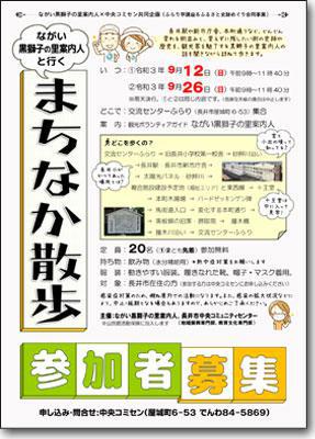 ※この事業は終了しました。ご参加ありがとうございました。 長井市の魅力を発信する観光ボランティアガイド・ながい黒獅子の里案内人のお話を聞きながら、新しい長井駅や変化を続ける本町通りなどを歩きます。変わる街並みと変えずに残したい街の史跡など「見てわかる歴史」を訪ねるまち歩きです。ぜひご参加ください! 〈主なコース〉※交流センターふらり発着・旧長井小学校第一校舎〜長井小学校・砂押川〜中央十字路 …大正3年に長井小学校が現在の場所に移転する前にあった区画を訪ねます! ・中央十字路〜長井駅・長井市新市庁舎〜複合施設建設予定地(福祉エリア) …市役所はどうして移転したの?駅前開発はどのように進むの? ・十王堂〜本町木揚場〜バードゼッキンゲン碑〜馬街道入口 …特別に十王堂の中を見せてもらいます!必見です。 ・本町通り〜黒板塀の旧家〜撞木川 詳しくはこちらから(チラシ・PDF) ながい黒獅子の里案内人・中央コミセン共同企画【ながい黒獅子の里案内人と行く まちなか散歩】 い つ:@令和3年9月12日(日)9:00〜11:40 A令和3年9月26日(日)9:00〜11:40 *@とAは同じ内容です。雨天決行(ただし、危険な天候の場合は中止します)。 どこで:交流センターふらり集合(屋城町6-53) 対 象:@Aとも長井市在住の方20名(先着) 参加無料 *感染症の拡大状況を考慮し、長井市在住の方のみとさせていただきます。 *@Aとも開催日の5日前までお申し込みください。 *なお、感染症の拡大状況などにより、延期・中止の場合があります。 あらかじめご了承ください。 主 催:ながい黒獅子の里案内人、長井市中央コミュニティセンター *中央コミセンふらり学講座&ふるさと史跡めぐり合同事業です。 申し込み:中央コミセン(電話:84-5869)