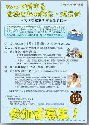 ※この事業は終了しました。ご参加ありがとうございました。 中央コミセン防災講座を開催します。「あの時に準備しておけば良かった」「まさかこんなことになるとは…」とならないために、災害が起きる前にできること、万が一の避難行動など、自分自身、そして家族のいのちと暮らしを守る【はじめの一歩】を学びませんか? い つ:令和3年11月14日(日)10:00〜12:00どこで:交流センターふらり(長井市屋城町6-53)内 容:講話、事例提供等 ・日常生活の中で気軽に取り入れられる減災の工夫術 ・「自助・共助・公助・近助」自分、家族、地域のつながりで守る術 ・備えてたい必要なもの、災害時に役立つアレコレ術。対 象:長井市民30名(先着) 参加無料講 師:細谷 真紀子さん(防災士、山形県自主防災アドバイザー)申し込み締め切り:令和3年10月22日(金)※先着です ※新型コロナウイルス感染症の拡大状況によっては中止になる場合があります。 詳しくはこちらから(PDF) 問いあわせ:長井市中央コミュニティセンター(長井市屋城町6-53) 電話とFAX:0238-84-5869 ※平日9:00〜17:00 Eメール:chuou-k3@jan.ne.jp