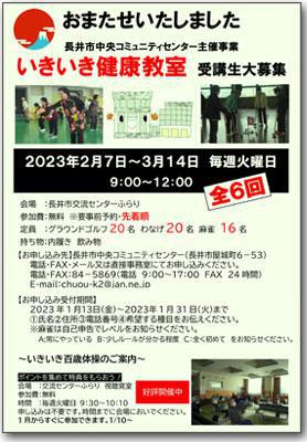 冬の運動不足解消と健康づくりを目的に開催しているいきいき健康教室。今回は3つの種目を全6回のコースで行います。ぜひご参加ください。いずれも定員がありますので、お早めにお申し込みください! い つ:令和5年2月7日(火)〜3月14日(火) 毎週火曜日 午前9時〜12時(全6回)どこで:長井市 交流センターふらり(長井市屋城町6-53)参加費:無料 ※要申込・先着順種 目:※1種目のみお選びください@屋内グラウンドゴルフ 定員:20名 ※要申込Aわなげ 定員:20名 ※要申込B麻雀(マージャン) 定員:16名 ※要申込※麻雀は申し込みの際にレベル(自己申告)をお知らせください。 A:常にやっている B:少しルールがわかる程度 C:全く初めて〇いきいき百歳体操 ※申し込み不要※いきいき百歳体操は毎週火曜日9時30分〜10時10分に行っています。 いつからでも参加可能です。 申し込み・問いあわせ:長井市中央コミュニティセンター(電話とFAX0238-84-5869)申込受付期間:令和5年1月13日(金)〜1月31日(火)※先着→ 氏名、住所、電話番号、希望する種目(麻雀はレベルも)をお知らせください。 詳しくはこちらから(チラシ・PDF) Instagramはこちら
