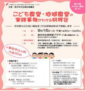 本イベントは終了しました。ご参加ご協力ありがとうございました。今年のふれあい福祉まつりは”研修会形式”で行います※※※事前申込み(先着35名)が必要です。※※※3年間中止としていました「ふれあい福祉まつり」ですが、今年度は、参加人数を限定し、”研修会形式”での開催を計画しました。 近年取組みが注目されている、こども食堂・地域食堂についての実践事例や実施のポイントなどを知ることができる貴重な機会となっております。ご興味・ご関心がある方々にぜひご参加いただきたく宜しくお願いいたします。◆日 時 令和5年9月16日(土)13:30〜16:30(開場13:00)◆場 所 長井市生涯学習プラザ 1F 舞と音楽のホール◆内 容 ・研修会「こども食堂・地域食堂の実践事例がわかる研修会」活動のポイント、市内実践者の活動事例紹介、交流会など・ブース出展 (13時〜14時)福祉事業所製品販売、フードバンク受付使用済み切手ボランティア受付◆参加申込(必ず事前の申し込みが必要です)・事前申込制(先着35名)・参加対象 長井市内在住の方・下記チラシを参照の上、電話・FAX・又は直接長井市社会福祉協議会窓口へお申込みください。・申込期限 9月5日(火)ふれあい福祉まつり「こども食堂・地域食堂の実践事例がわかる研修会」チラシ.PDF※参加は事前申込制としております。上記チラシを参照の上、電話・FAX・又は直接長井市社会福祉協議会窓口へお申込みください。こども食堂・地域食堂にご関心のある方のご参加をお待ちしております!【お問合せ先】長井市社会福祉協議会 担当/荒井・高野住所:山形県長井市館町北6-19電話:0238-88-3711FAX:0238-88-3712