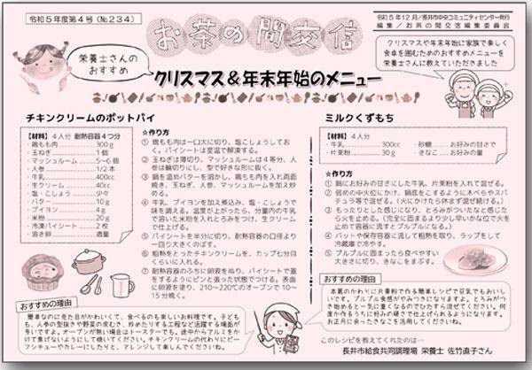 子育ての悩みや家庭教育などの問題について学び、情報交換を行うお茶の間交信。今年度第4号を発行しました。 今回は、親子で作って気持ちがポカポカするようなおすすめ料理のレシピを、長井市内の保育施設に給食を提供している栄養士さんから教えてもらいました。保育施設の紹介は白ゆり保育園です。どうぞご覧ください。 お茶の間交信は保育の専門家を中心とした編集委員と、子育て中の読者の皆さんで作りあげる情報紙です。ご感想、ご意見を返信としてどんどんお寄せ下さい。メールでも結構です。 お茶の間交信(No.234)はこちらから(PDF) Instagramはこちら