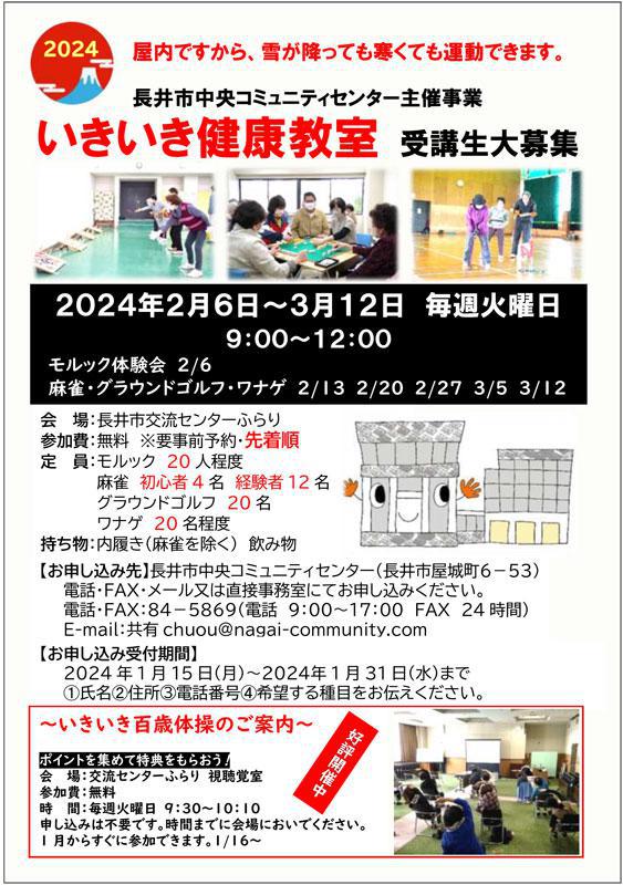 冬期間の運動不足解消や交流を目的に、今年も いきいき健康教室 を行います。 今回は フィンランド発祥のニュースポーツ モルックの体験会(2/6 1回)、そして、麻雀、グラウンドゴルフ、ワナゲ(2/13〜3/12 火曜 5回)を行います。 参加無料、長井市内の方ならどなたでも参加可能です。いずれも定員がありますので、興味のある方はお早めにお申し込みください。 令和6年2月6日(火)9:00〜12:00 モルック体験会 定員:20名程度2月13日、20日、27日、3月5日、12日 いずれも火曜日(全5回)9:00〜12:00麻雀 定員:経験者12名 ※初心者コースは定員になったため締め切りました屋内グラウンドゴルフ 定員:20名ワナゲ 定員20名 詳しくはこちらから(PDF) なお、いきいき百歳体操は引き続き継続します。毎週火曜日9:30〜10:10です。 ▽いきいき百歳体操(Facebook) Instagramはこちら