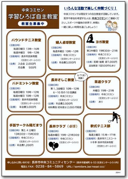 長井市中央コミュニティセンターで活動している学習ひろば「自主教室」の教室生を募集します。 9つの教室がサークル形式で、バウンドテニス、バドミントン、ヨガ、軟式テニス、卓球、茶道、手話、長井さしこに取り組んでいます。 興味のある方は、ぜひ中央コミセン(0238-84-5868 または 0238-84-5869)までご連絡ください。 学習ひろば「自主教室」参加者募集(PDF) Instagramはこちら
