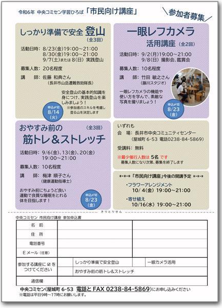 ※この募集は終了しました 中央コミセン「市民向け講座」では、新たなメニューの受講者を募集しています。8〜9月は初めての企画「しっかり準備で安全登山」、昨年も好評だった「お休み前の筋トレ&ストレッチ」、そして「一眼レフカメラ活用講座」の教室を行います。夏のチャレンジにいかがでしょうか? たくさんのご参加をお待ちしています。 〇しっかり準備で安全登山(全3回)日 時:8月23日(金)、8月30日(金)19:00〜21:00〈座学〉 9月7日(土)または9月8日(日)実践登山受講料:無料定 員:20名程度講 師:佐藤和典さん(長井市山岳遭難救助隊長) 〇お休み前の筋トレ&ストレッチ(全3回)日 時:9月6日(金)、13日(金)、20日(金)19:00〜21:00受講料:無料定 員:10名程度講 師:梅津順子さん(健康運動指導士) 〇一眼レフカメラ活用講座(全3回)日 時:9月2日(月)19:00〜21:00、8日(日)撮影会、鑑賞会受講料:無料定 員:10名程度講 師:竹田敏之さん(藤川スタジオ) ※いずれも最少催行人数は5名です。※お申し込みは、電話かFAX、Eメールでお願いします。 名前、住所、電話番号をお知らせください。 詳しくはこちらから(チラシ・PDF) 〈お申し込み〉長井市中央コミュニティセンター電話とFAX:0238-84-5869Eメール:chuou@nagai-community.com Instagramはこちら