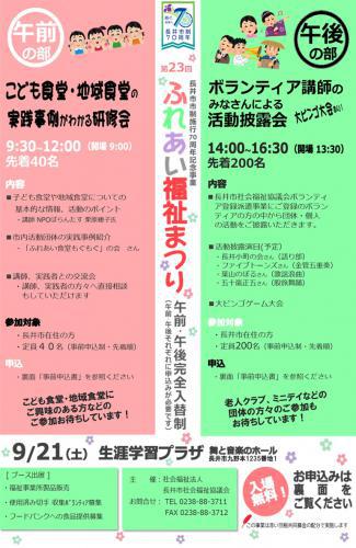 本イベントは終了しました。ご参加ご協力ありがとうございました。尚、午後の部として開催を予定しておりました「ボランティア講師の皆さんによる活動披露会」は荒天が予想されたことから参加者様の安全を考慮し、午後の部を中止とさせて頂きました。参加を楽しみにしていただいた皆様には、ご迷惑をお掛けいたしましたこと、心よりお詫び申し上げます。ー・ー・ー・ー・ー・ー・ー・ー・ー・ー・ー・ー・ー・ー・ー・ー今年のふれあい福祉まつりは”午前・午後二部制”で行います!参加費無料!午後の部ではビンゴ大会もアリ!ぜひぜひご参加ください!第23回ふれあい福祉まつり 「こども食堂・地域食堂の実践事例がわかる研修会」 「ボランティア講師の皆さんによる活動披露会」(長井市市制施行70周年記念事業)コロナ期間を経て昨年度から再開いたしました「ふれあい福祉まつり」ですが、今年度は、下記のとおり午前・午後の2部制とする内容での開催を計画いたしました。内容にご興味・ご関心のある方々のご参加をお待ち申し上げます。お気軽にご参加ください!1.基本情報@期日 令和6年9月21日(土)※詳しい時間は下記「2.イベント内容」を参照くださいA場所 長井市置賜生涯学習プラザ1F 舞と音楽のホールB主催社会福祉法人 長井市社会福祉協議会C参加費 無料Dその他昼食の準備はございませんのでご了承下さい2.イベント内容【午前の部】「こども食堂・地域食堂の実践事例がわかる研修会」 ★こども食堂に興味のある方などにおすすめ!!@時 間午前9時30分〜午後12時(午前9時開場) A参加対象こども食堂・地域食堂に興味のある方B定 員40名(事前申込制)※定員になり次第締め切りとなりますC申込下記チラシ裏面の参加申込書を参照いただき、電話、FAX、メールにて長井市社会福祉協議会までお申込みください第23回ふれあい福祉まつりチラシ.PDFD申込期限 9月5日(木) E内 容・こども食堂、地域食堂の基本情報、活動のポイント・地域食堂の市内の実践団体の事例紹介・講師、実践者との交流会【午後の部】 「ボランティア講師の皆さんによる活動披露会(ビンゴ大会あり!)」★高齢者の方やボランティアに興味のある方におすすめ!!@時 間午後2時〜午後4時30分 (午後1時30分開場)A参加対象 ボランティア講師の活動(踊り、語り部、演奏など)をご覧になりたい方(老人クラブ・ミニデイなどの皆さまのご参加をお待ちしております)B定 員200名(事前申込制)※定員になり次第締め切りとなりますC申込下記チラシ裏面の参加申込書を参照いただき、電話、FAX、メールにて長井市社会福祉協議会までお申込みください第23回ふれあい福祉まつりチラシ.PDFD申込期限 9月5日(木)E内 容 ・ボランティア講師の活動披露とインタビュー(演目(予定):歌、股旅舞踊、語り部、管楽器演奏など)・大ビンゴ大会ご不明な点は、長井市社会福祉協議会までお気軽にお問合せくださいどなたでも参加いただけます!午後の部は、参加賞(せせらぎの家のパンをプレゼント!)、ビンゴ大会もアリ!!ぜひぜひご参加ください!!