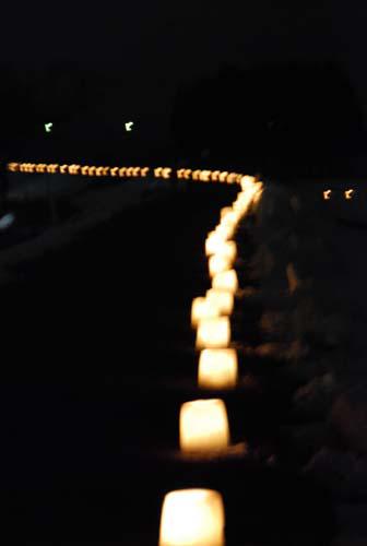 フットパスルートにもなっている最上川沿いの小道と堤防上の歩道にほのかなろうそくの明かりが灯りました。